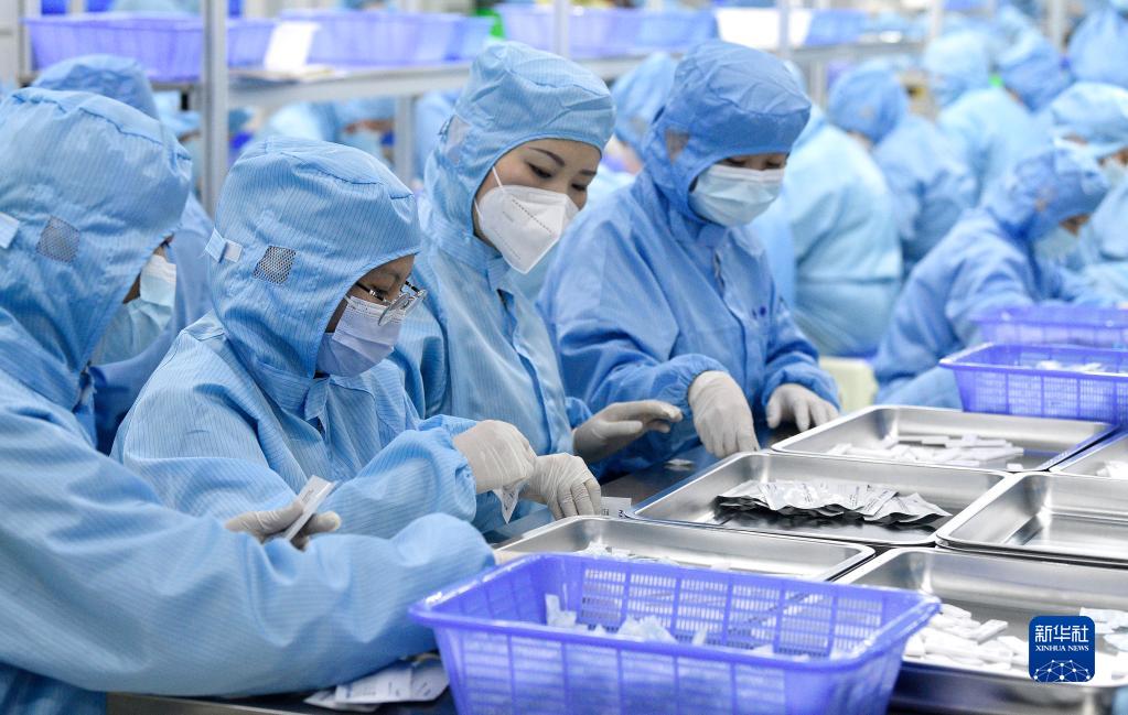 西安一家醫療器械企業的工作人員在生產抗原檢測試劑(1月4日攝)。