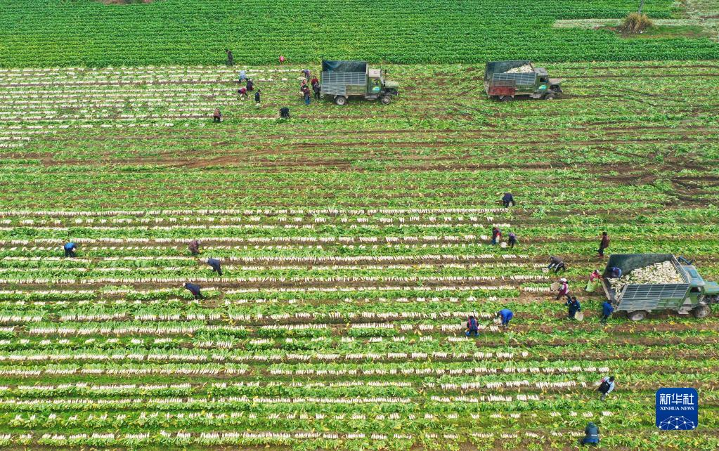 1月5日,在湖南省衡陽縣關市鎮鑫粵農業生態蔬菜種植基地,村民將采收的蘿卜裝車 (無人機照片)。