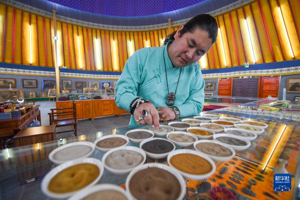 內蒙古錫林郭勒盟正藍旗位于渾善達克沙地腹地,生活于此的80后蒙古族青年阿拉騰畢力格取沙為材,進行沙畫藝術作品創作。他對渾善達克沙地中顏色各異的沙粒進行淘洗、篩選、清理雜質、曬干等操作后,加上用糯米汁、牛角等材料熬制而成的天然膠水,就能使各色沙粒在充分粘貼的情況下,依然保持其色彩。他的沙畫作品色彩自然、造型古樸,獨具特色。