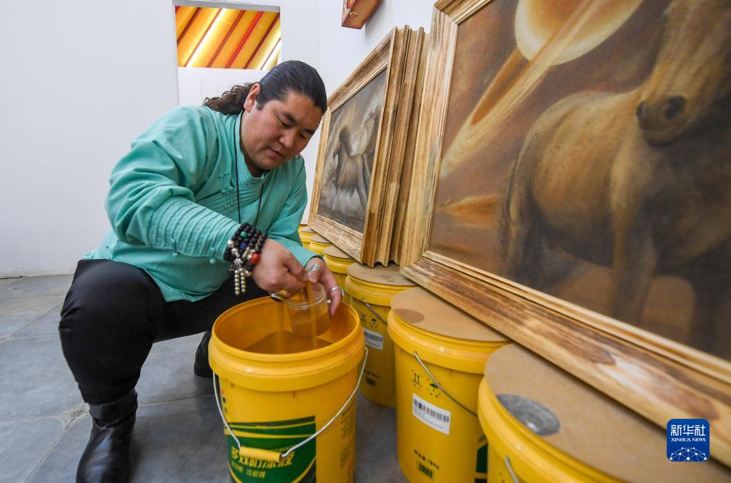 內蒙古錫林郭勒盟正藍旗位于渾善達克沙地腹地,生活于此的80后蒙古族青年阿拉騰畢力格取沙為材,進行沙畫藝術作品創作。他對渾善達克沙地中顏色各異的沙粒進行淘洗、篩選、清理雜質、曬干等操作后,加上用糯米汁、牛角等材料熬制而成的天然膠水,就能使各色沙粒在充分粘貼的情況下,依然保持其色彩。他的沙畫作品色彩自然、造型古樸,獨具特色。