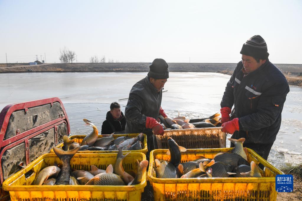 冬日時節,內蒙古達拉特旗樹林召鎮的村民在結冰的魚塘上鑿冰、拉網,捕撈人工養殖的“黃河魚”,以備春節前夕上市。達拉特旗位于黃河“幾”字彎,人工養殖的“黃河魚”是當地的一大特色。