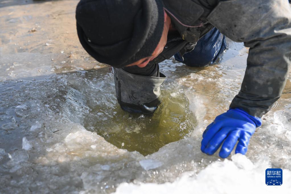 1月5日,達拉特旗樹林召鎮的村民在魚塘冰面上作業。