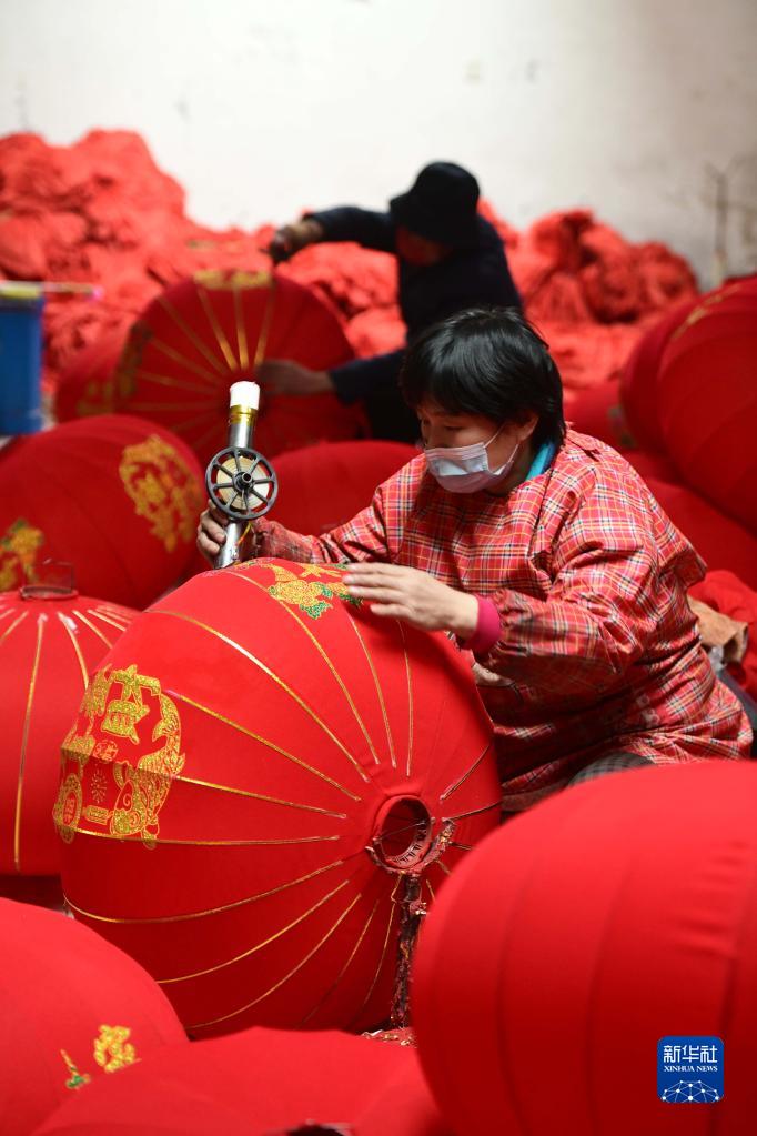 1月5日,在河北省石家莊市藁城區屯頭村,一家宮燈企業的工人制作宮燈。