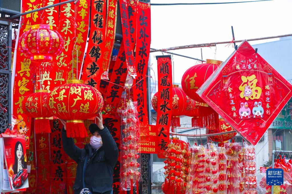 春節臨近,年味漸濃,河南省信陽市以“兔年”為主題的各種對聯、年畫、“?!弊值蕊椘芳娂娚霞?,成為市民搶手的熱門商品。