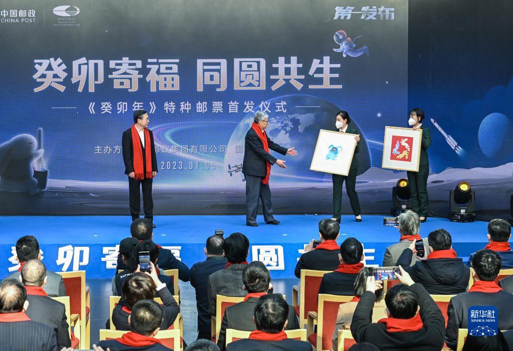 1月5日,由藝術家黃永玉繪制的郵票設計畫稿在《癸卯年》特種郵票首發儀式上亮相。