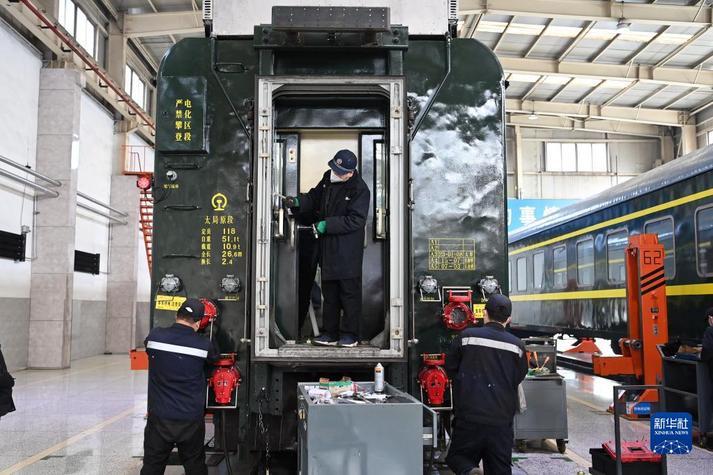 1月6日,在中國鐵路太原局集團有限公司太原車輛段太原檢修車間,工作人員在進行車端折棚風擋檢修作業。
