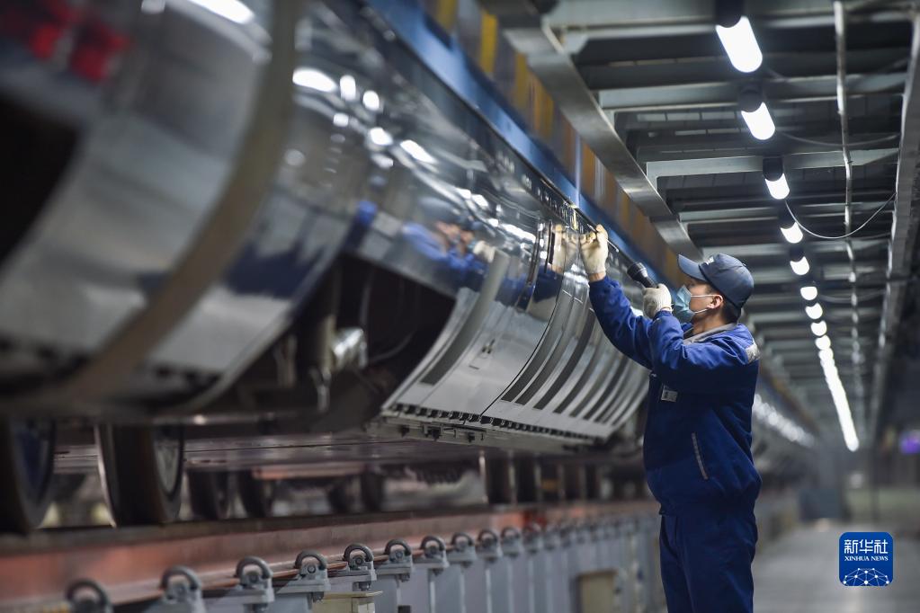 1月6日,在南京動車段南京南動車運用所檢修庫,地勤機械師在檢修動車車體。