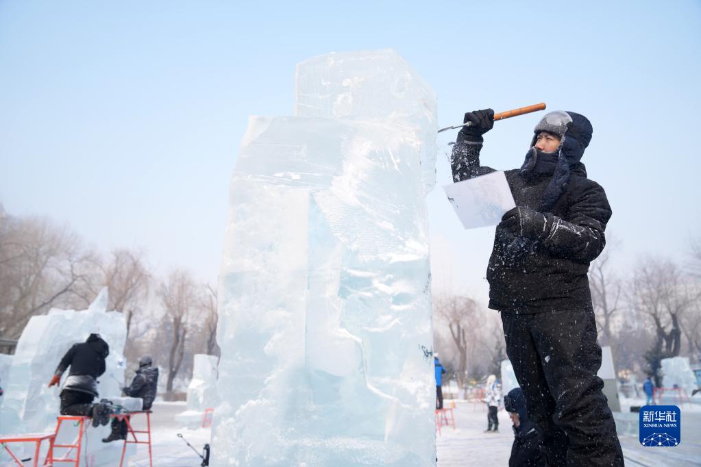 1月6日,在哈爾濱冰燈藝術游園會園區,冰雕師在進行冰雕作品創作。