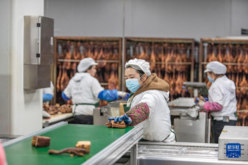 1月4日,在重慶市城口縣坪壩鎮新華村重慶美綴美食品有限公司,工人在外包裝車間將分割好的臘肉放上自動包裝流水線。