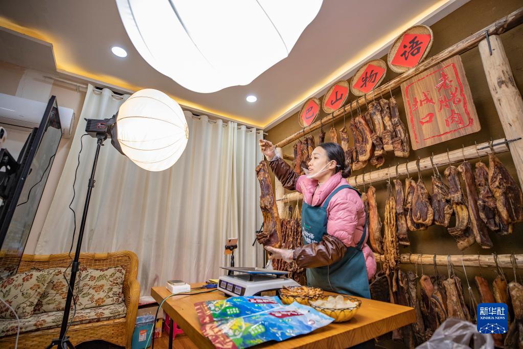 1月4日,在重慶市城口縣巴山物語電商超市,主播向直播間的觀眾展示推銷城口臘肉。