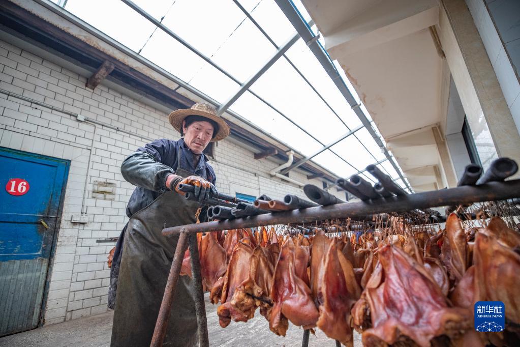 1月4日,在重慶市城口縣修齊鎮趙孝春野生食品開發有限公司,工人碼放熏制好的臘味。