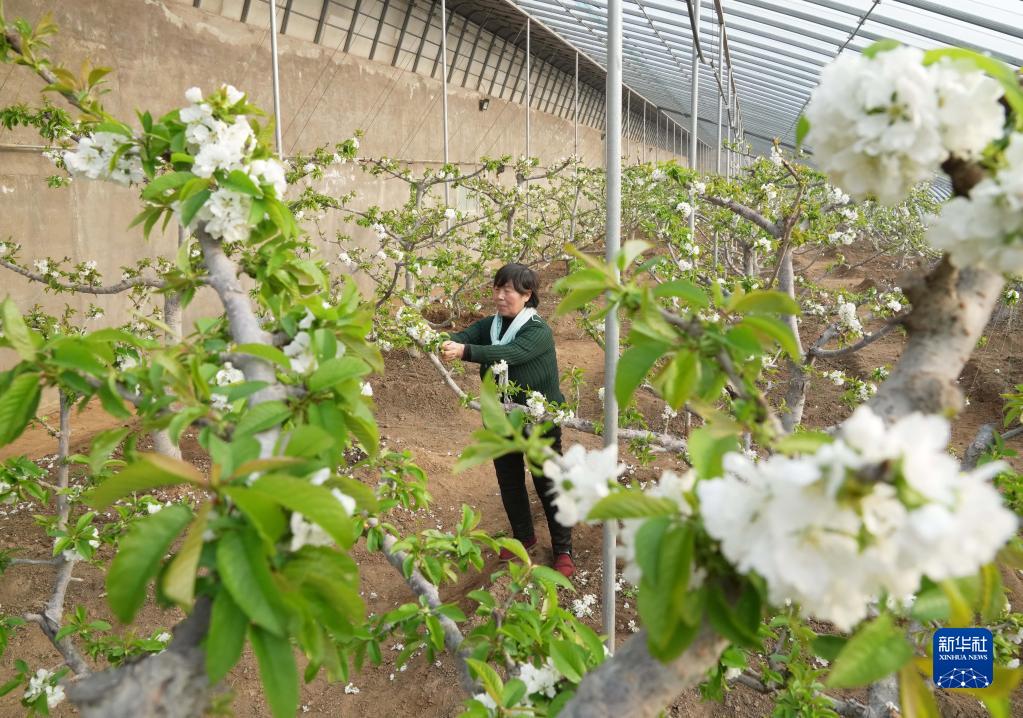 1月6日,在秦皇島市海港區海陽鎮一家櫻桃種植合作社,農民在大棚內給櫻桃樹疏花。