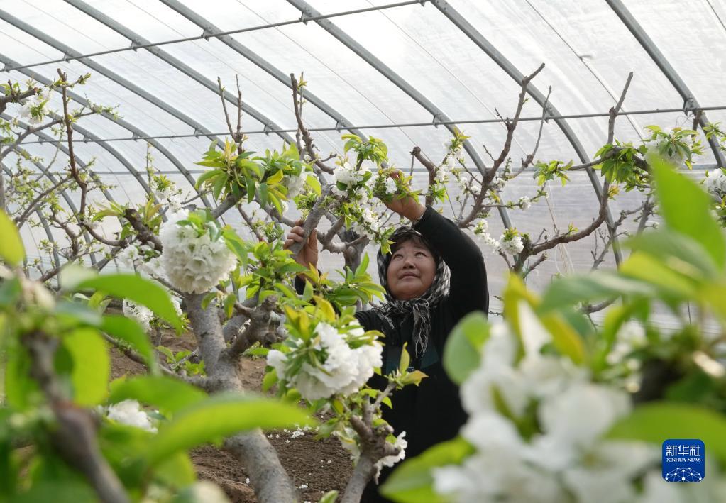 1月6日,在秦皇島市海港區海陽鎮一家櫻桃種植合作社,農民在大棚內給櫻桃樹疏花。