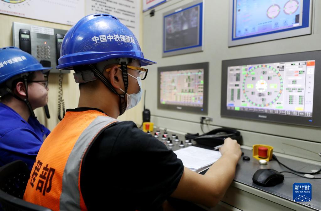 1月6日,在中鐵隧道局上海市域鐵路機場聯絡線11標項目施工現場,技術人員在虹浦號盾構機主機室內監測設備運行情況。