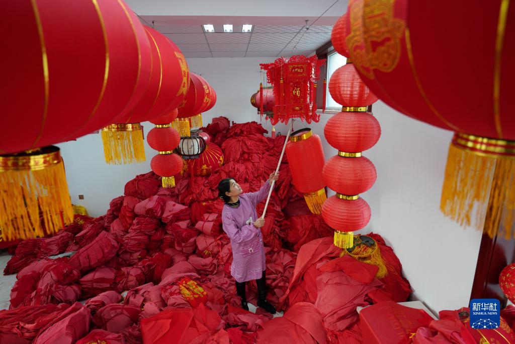 1月6日,河北省沙河市十里亭鎮曹章村燈籠制作工坊的工人整理制作好的紅燈籠。