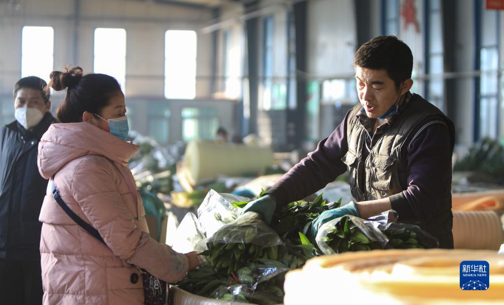 1月5日,花農在凌源花卉交易市場內打包鮮花。
