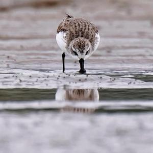 勺嘴鷸在灘涂覓食(1月5日攝)。