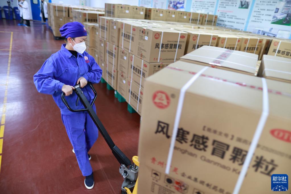 1月6日,在貴州安順一家藥企,工作人員在搬運風寒感冒顆粒藥品。