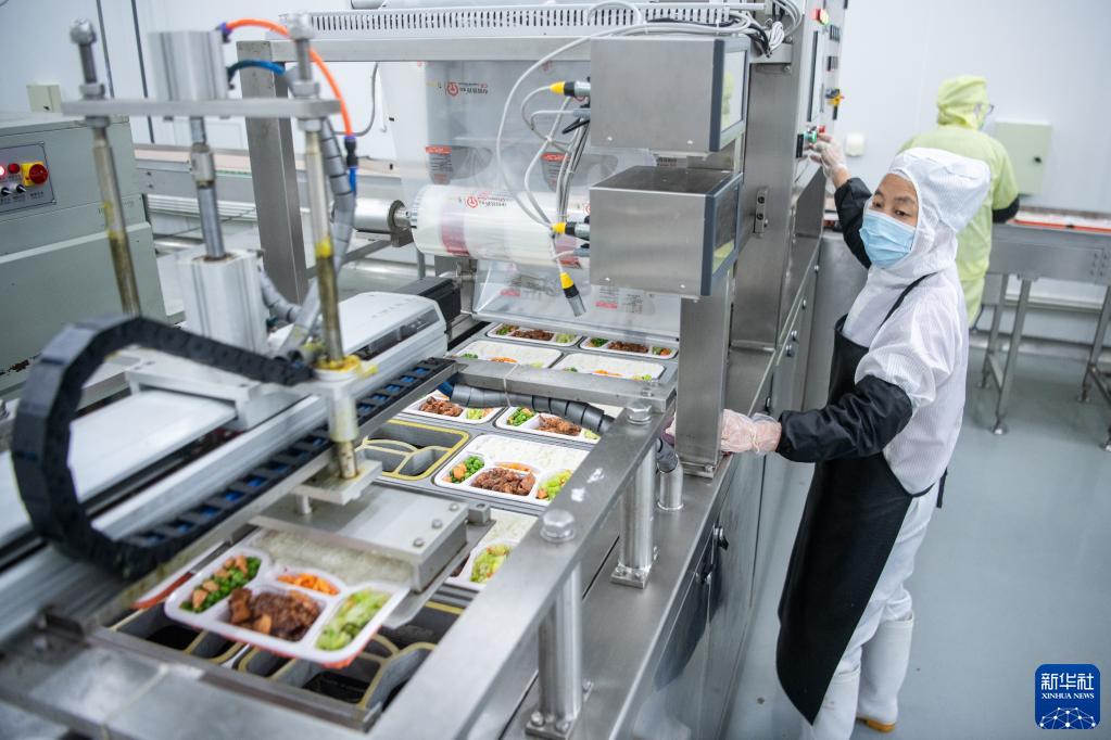 1月6日,武東餐飲基地工作人員操作全自動真空封口包裝機對盒飯進行覆膜包裝。