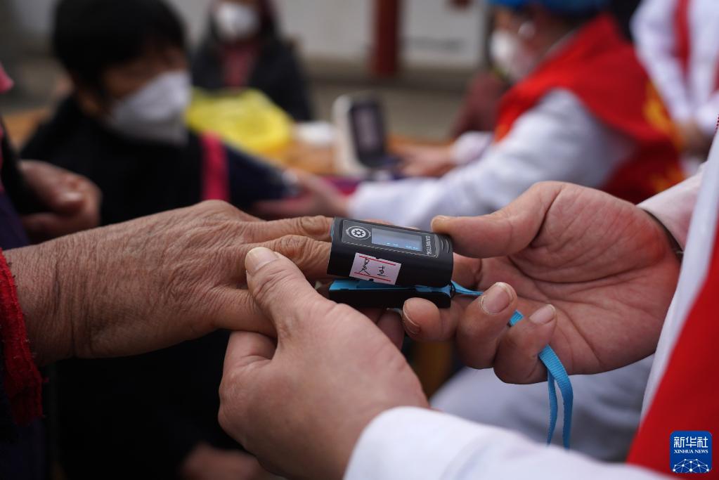 在南昌市經濟技術開發區冠山管理處楓林村,醫務人員為村民進行血氧飽和度監測(1月5日攝)。