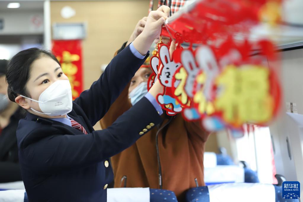 當日,中國鐵路南昌局集團有限公司南昌客運段的工作人員在G5305次列車與旅客一起掛中國結、貼春聯,營造喜慶氣氛。