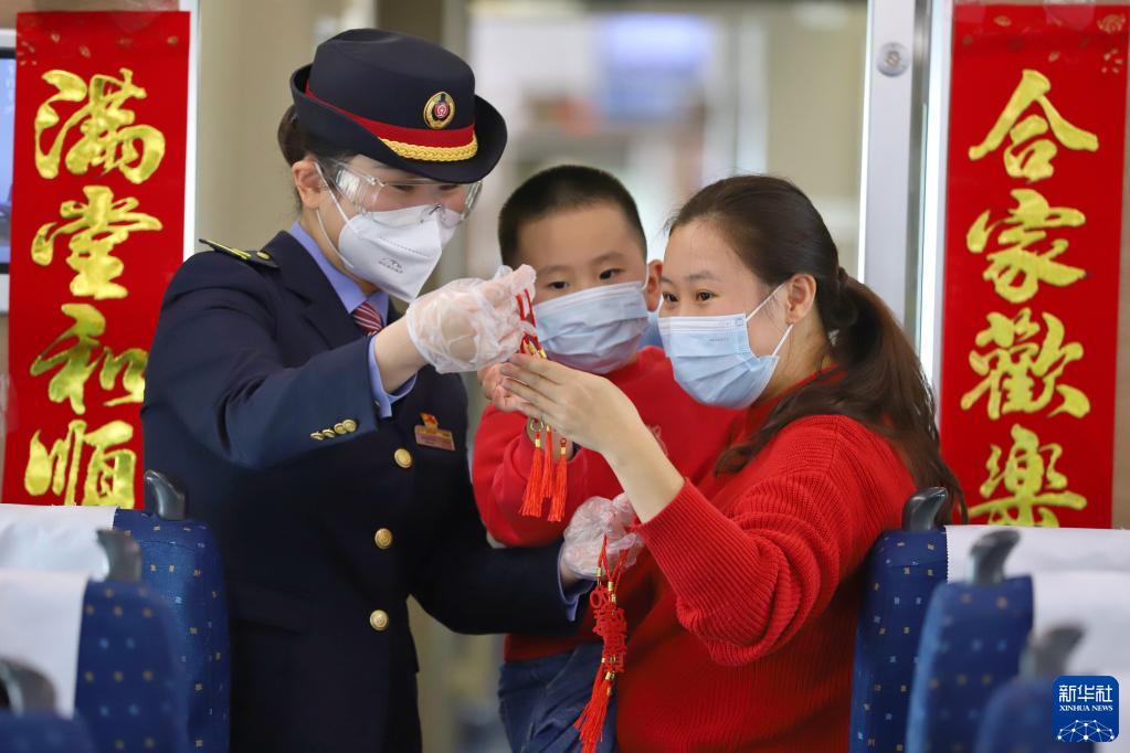 當日,中國鐵路南昌局集團有限公司南昌客運段的工作人員在G5305次列車與旅客一起掛中國結、貼春聯,營造喜慶氣氛。