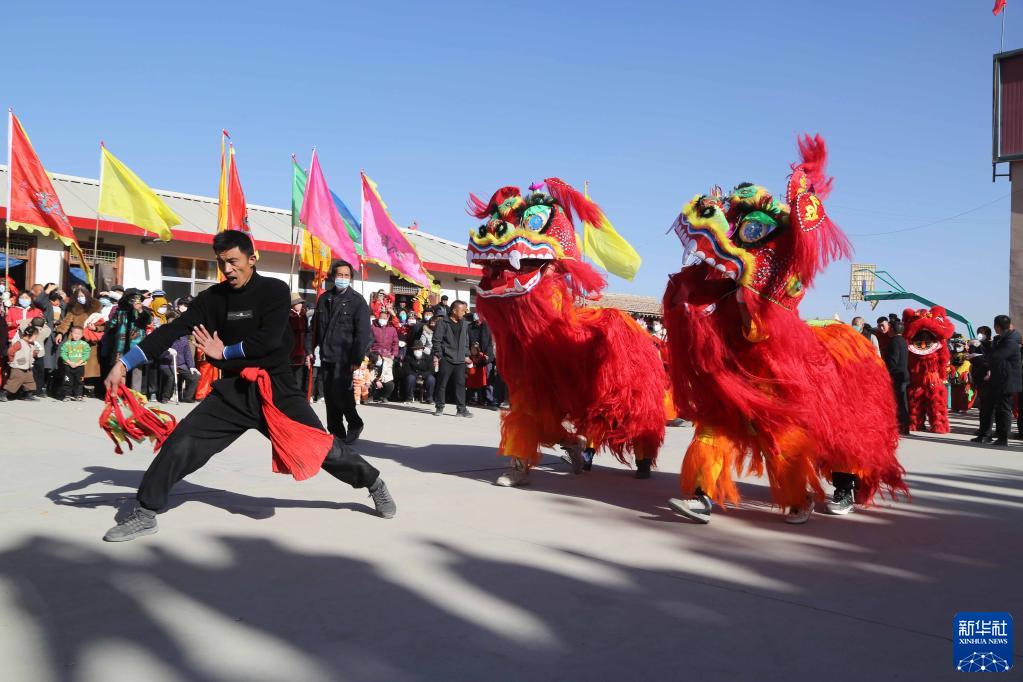 1月6日,甘肅省定西市安定區內官營鎮萬崖村社火隊演練傳統社火節目舞獅。