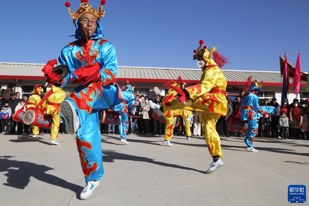 1月6日,甘肅省定西市安定區內官營鎮萬崖村社火隊演練傳統社火節目。
