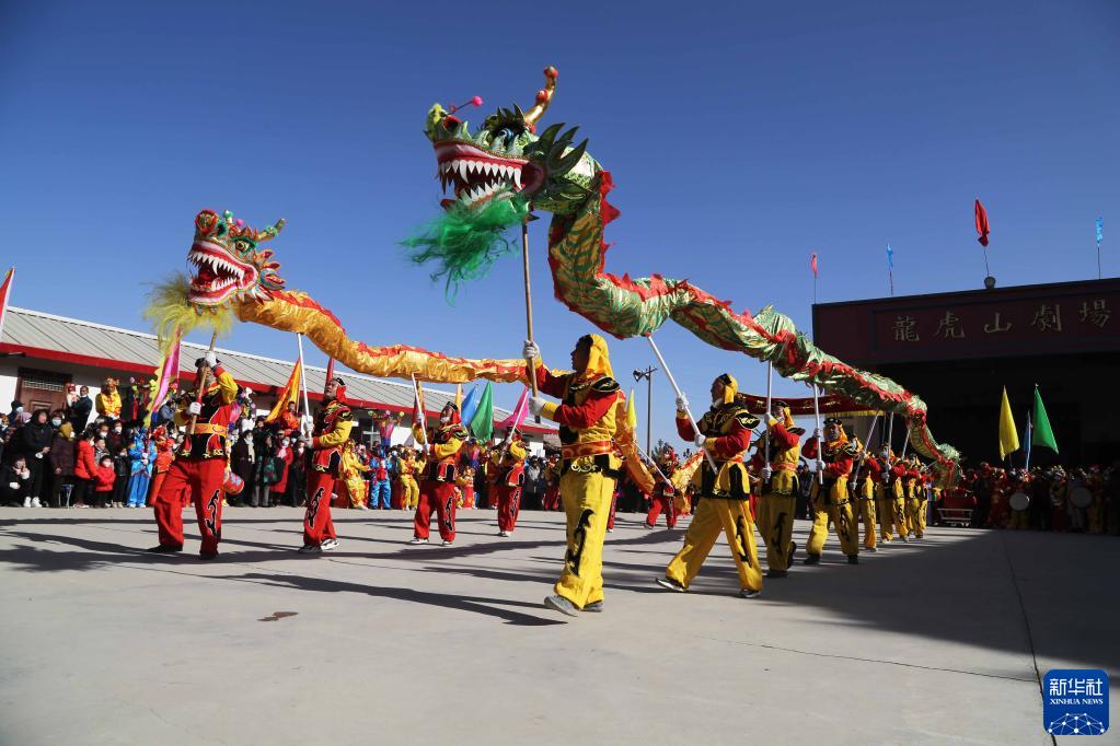 1月6日,甘肅省定西市安定區內官營鎮萬崖村社火隊演練傳統社火節目舞龍。