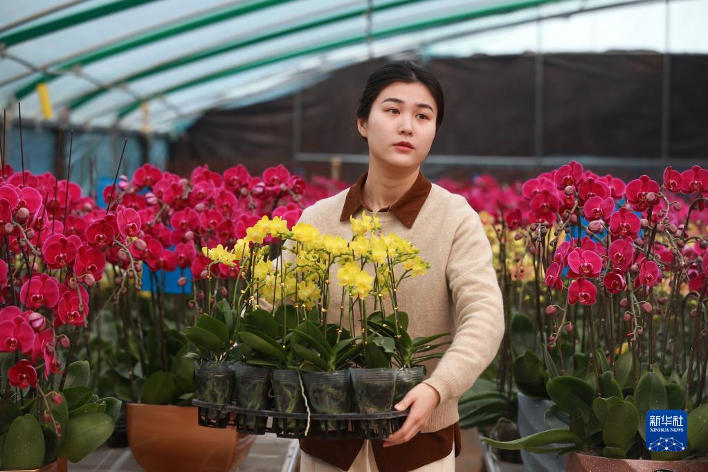 春節臨近,在安徽省淮北市烈山區華家湖社區蝴蝶蘭種植基地智能化溫室大棚內,10萬余株各色蝴蝶蘭競相綻放。工作人員忙著管理、搬運蝴蝶蘭,供應各地節日市場。