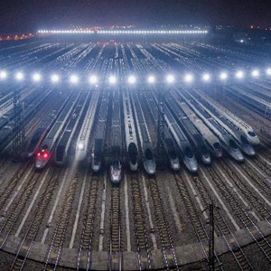 1月7日,2023年春運啟動。在武漢動車段,工作人員通宵對近130組動車進行檢修、保溫作業,??吭诖孳嚲€上的動車排列整齊如同一支“陸地艦隊”。