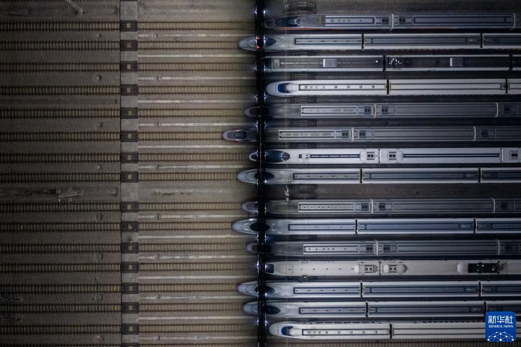 1月7日,2023年春運啟動。在武漢動車段,工作人員通宵對近130組動車進行檢修、保溫作業,??吭诖孳嚲€上的動車排列整齊如同一支“陸地艦隊”。