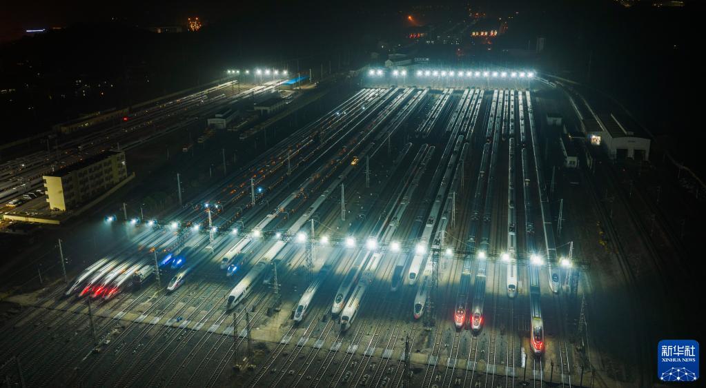 1月7日,2023年春運啟動。當日凌晨,??吭诤祥L沙動車運用所的動車組列車排列整齊,如同一支“陸地艦隊”。