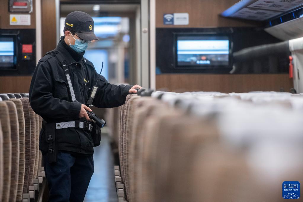 1月6日,地勤機械師在檢查動車組列車座椅。
