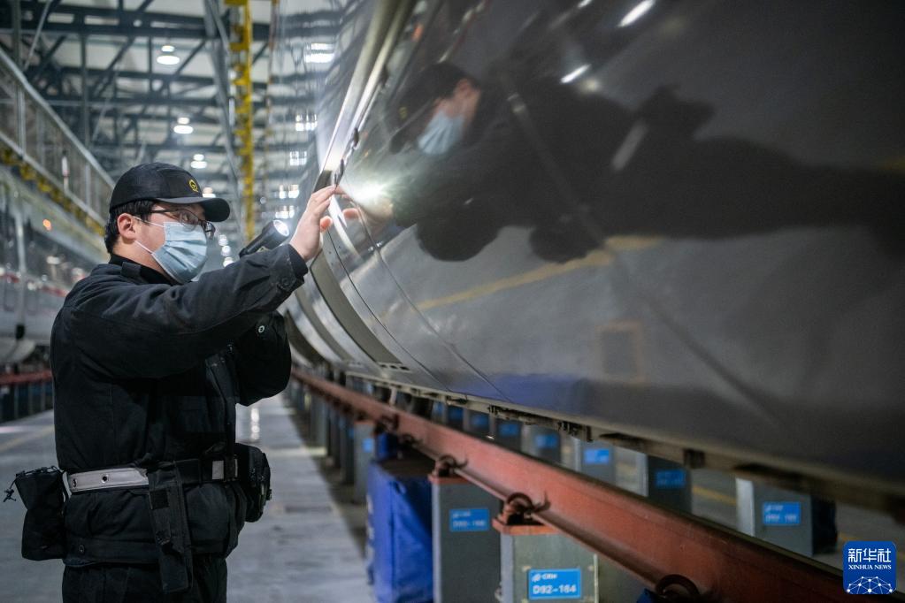 1月6日,地勤機械師在檢查動車組列車車體外觀狀態。