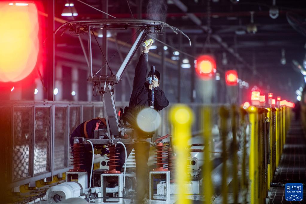 1月6日,地勤機械師在檢修動車組列車的受電弓。