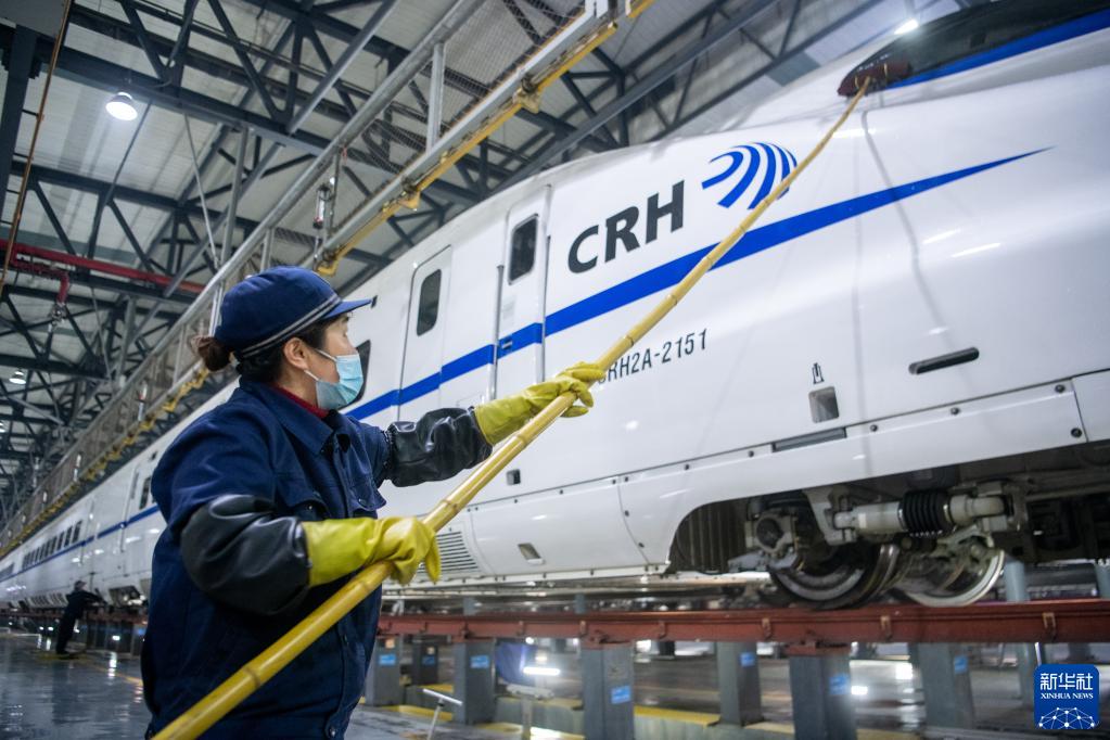 1月6日,保潔人員在清洗動車組。