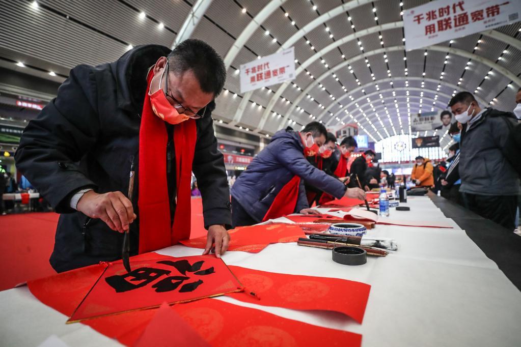 1月7日,書法家在沈陽站內為旅客書寫福字、對聯。