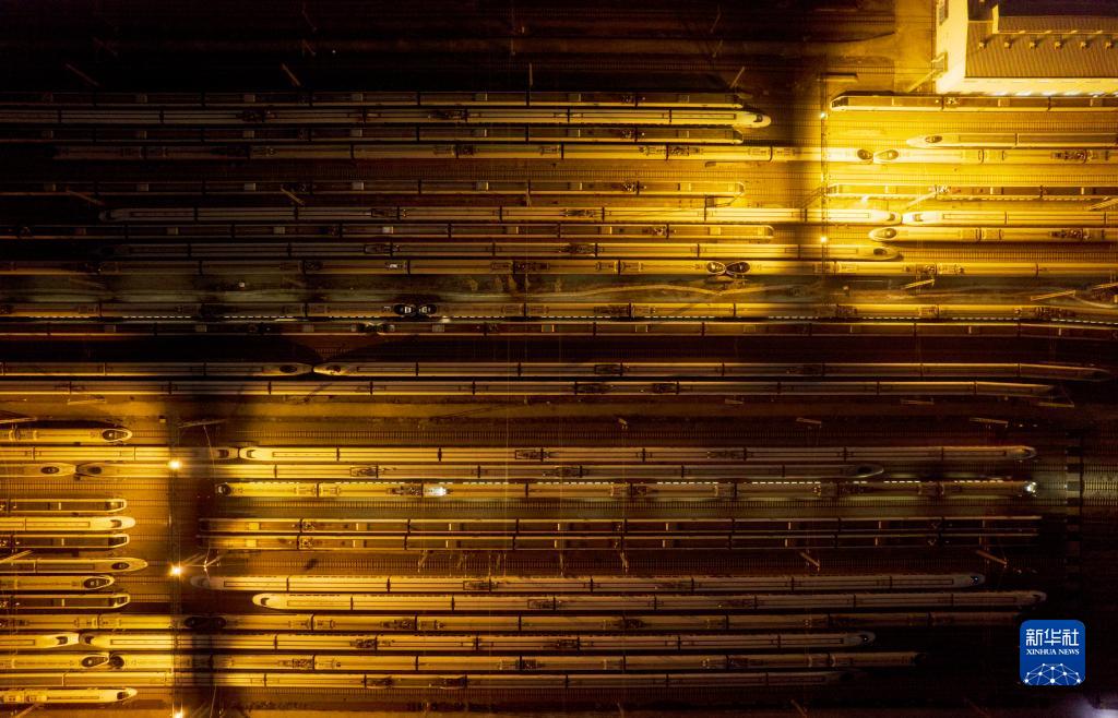 1月7日,動車組列車??吭诟V菽蟿榆囁孳嚲€上(無人機照片)。