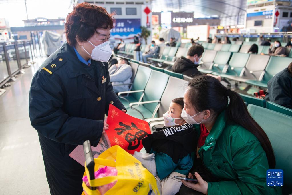1月7日,在長沙南站候車室,工作人員給旅客送“?!弊?。