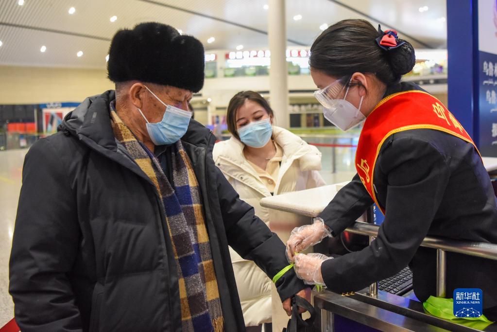 1月7日,在烏魯木齊站候車大廳,工作人員為老年乘客系上“綠絲帶”,為旅客提供優先進站、協助乘降、便利出站等服務。