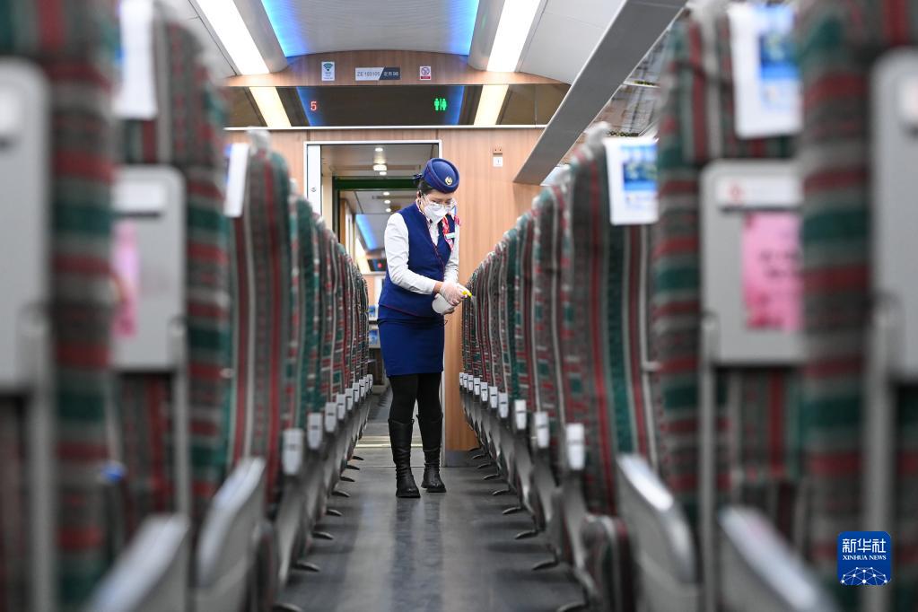 1月7日,在烏魯木齊站,C861次動車的列車員在車廂噴灑消毒液。