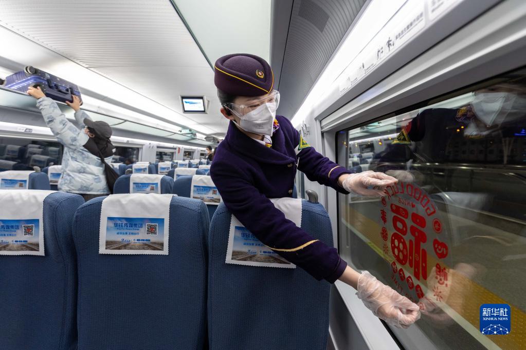 1月7日,在上海虹橋火車站,上??瓦\段乘務員在G4831次春運臨客列車上貼“?!弊?。