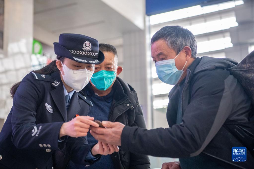 1月7日,在重慶北站候車廳,鐵路警察在解答旅客疑問,指引乘車。