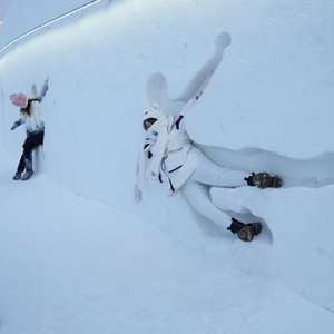 近日,許多游客來到哈爾濱冰雪大世界,在一面有著數十個不同造型人形凹槽的雪墻前“打卡”留影。