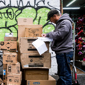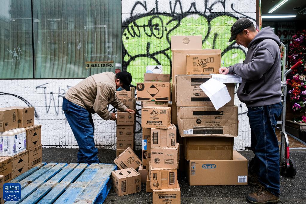 1月6日,兩名工人在美國紐約一家商店門口卸貨。