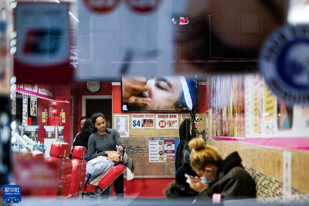 1月6日,美國紐約一家美發沙龍的工作人員為顧客服務。