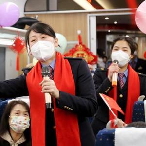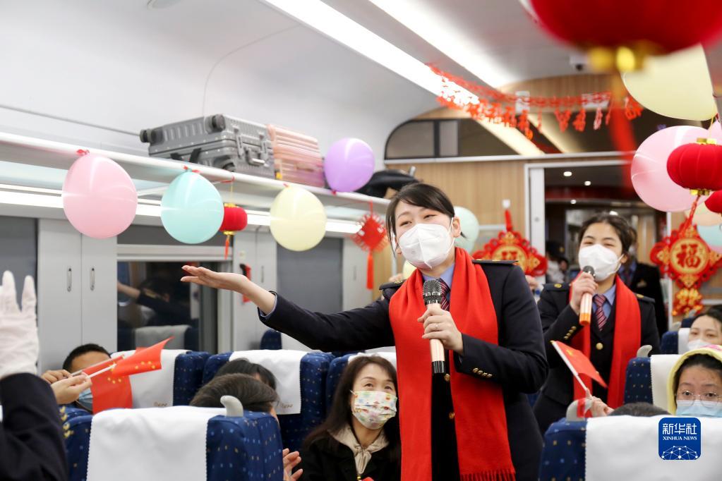 春運首日,在北京豐臺開往福州的D759次列車上,擔任乘務工作的中國鐵路南昌局集團有限公司福州客運段福京車隊的黨團員、青年骨干組成志愿者服務隊為旅客表演文藝節目、開展互動游戲,讓春運旅途充滿歡歌笑語。