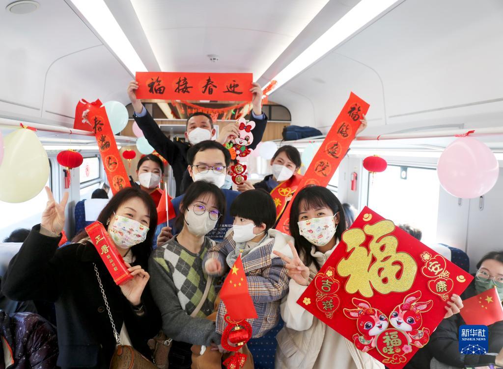 1月7日,旅客和乘務員在北京豐臺開往福州的D759次列車車廂里合影。