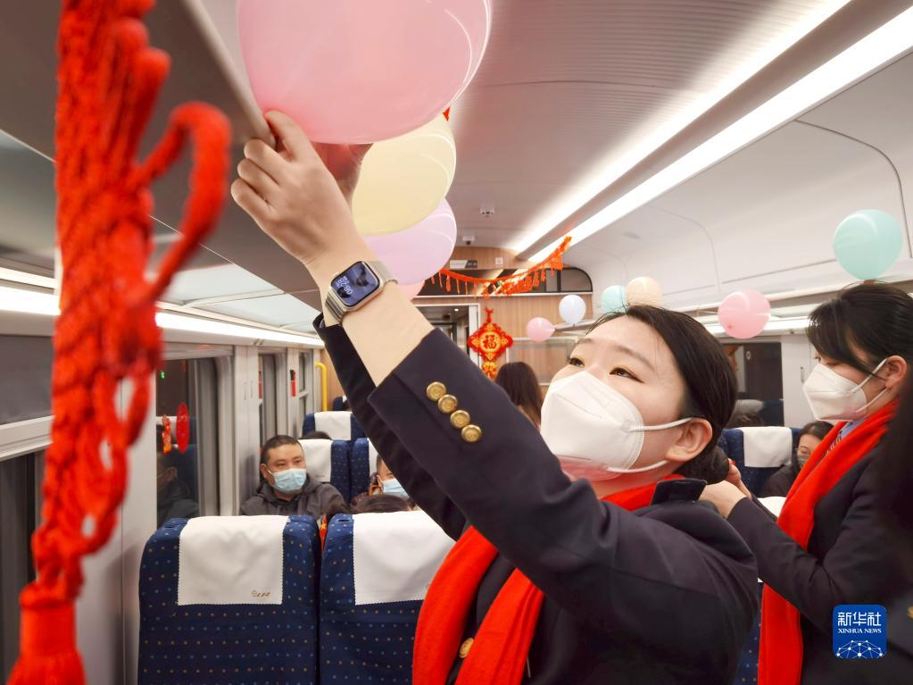 1月7日,乘務員在裝飾北京豐臺開往福州的D759次列車車廂。